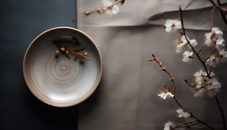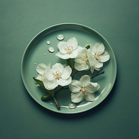 An AI generated illustration of a white plate white cherry flowers on a green background