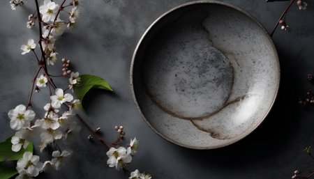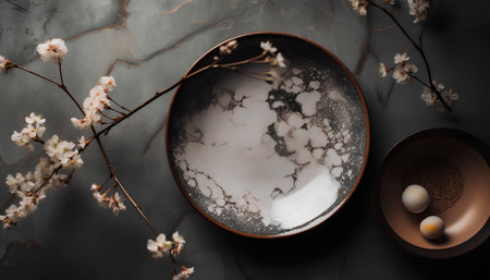 Cherry blossom and ceramic plate on dark background, top view