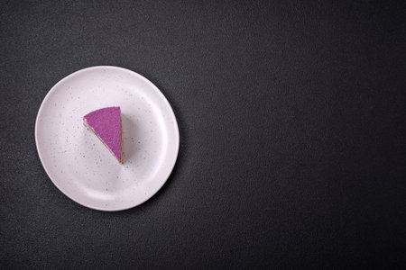 Delicious fresh sweet mousse cake with berry filling topped with pink velvet topping on dark concrete background