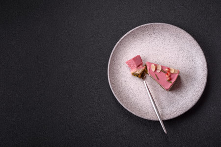 Piece of sweet cheesecake with pink cream cheese of raspberry or strawberry flavor on a dark textured background