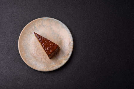 A slice of sweet layered cake covered in chocolate with nuts and caramel. A slice of chocolate cake as a food background for your design.