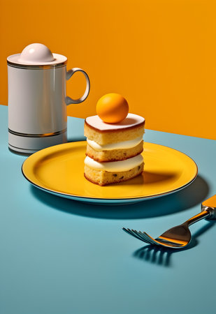 Realistic cake with high detail in cozy atmosphere of neutral colors and warm lighting. Extreme long shot of an empty restaurant. Generative AI Generated