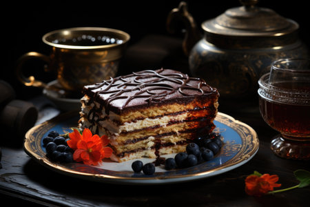 a chocolate and blue cake slice sits on a brown plate, showcasing photorealistic fantasies. this 8k 3d creation, rendered with vray, features delicate flora depictions. the highly realistic and finely rendered textures make it hard to believe how beautiful this cake slice looks. ai generated