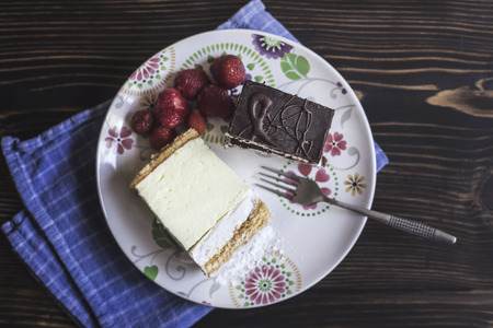 Dark beer chocolate cake on white plate and decorated with strawberries, blueberries and pistachio on wooden table.