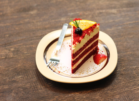 Red velvet cake with fresh strawberries and lemon on wooden background, sweet dessert