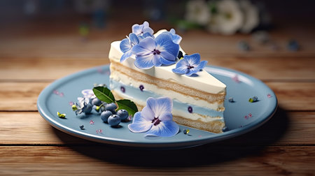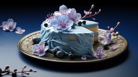 a piece of cake adorned with blue flowers sits on a table in this digitally manipulated image. the use of vray tracing and cranberrycore techniques creates an organic and fluid aesthetic. the matte photo showcases elegant inking techniques, resulting in a multilayered dimension. ai generated