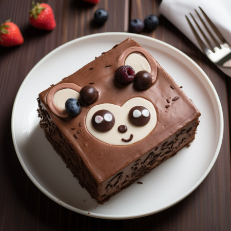 a white plate showcases a chocolate bear cake adorned with an assortment of berries and strawberries. this high-quality photo captures the whimsical essence of cartoon-inspired pop art. the tachisme technique creates rectangular fields, adding depth to the image. taken with a nikon d750, the photo beautifully incorporates animal motifs and lively facial expressions. ai generated