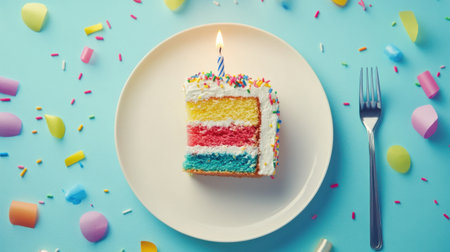 A single slice of colorful layered cake with a candle sits on a plate, surrounded by festive confetti and sprinkles, perfect for birthday celebrations and joyful gatherings.