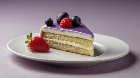 Beautiful piece of cake with fruit on a light purple background. Generated by AI.