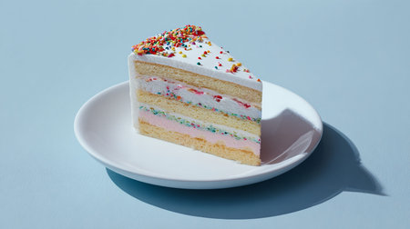 A tempting slice of birthday cake adorned with colorful sprinkles, elegantly presented on a plate, perfect for festive celebrations and joyful gatherings.