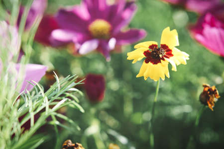 Sunny day on the flowers meadow. Beautiful natural background.