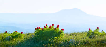 Red flowers on soft pastel color in blur style. Natural panoramic background.