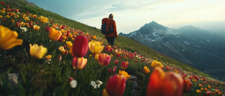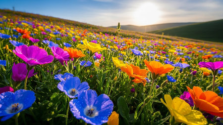 Cinematic view of rolling hills adorned with vibrant wildflowers under a blue sky