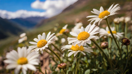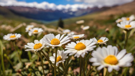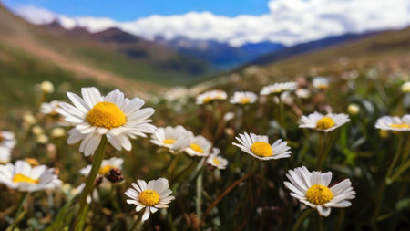 Beautiful scenery of a field of white flowers. Green mountain landscape