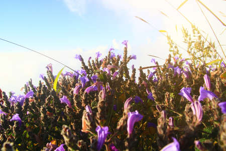 Beautiful wild Purple flowers with golden light in sunrise. Blossom spring field floral with blue sky in forest on the mountain, Thailand