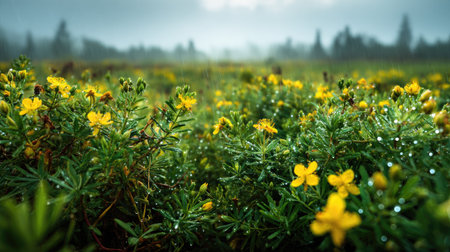 A panoramic wide view of St John s wort field growing closely together under light drizzle soft raindrops on leaves ultra realistic photography natural daylight cinematic wide composition lifelike natural scene