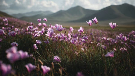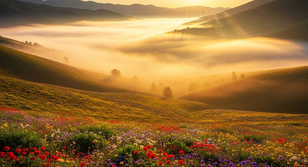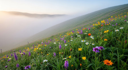 Cinematic view of rolling hills adorned with vibrant wildflowers under a clear sky