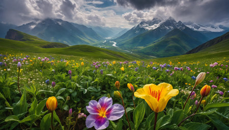 Beautiful scenery of the mountain valley and alpine meadow with purple flowers on the foreground. Outdoor and hiking concept