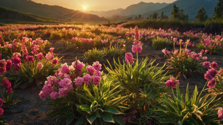 A close-up of vibrant wildflowers in a grassy field with majestic mountain ranges in the background. The setting sun casts a warm golden glow over the landscape, creating a serene and peaceful atmosphere.