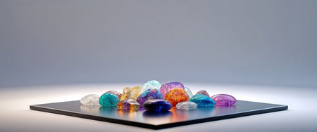 A stunning close-up of colorful crystals scattered across a surface, showcasing vibrant light reflections and unique textures that create an artistic visual appeal.