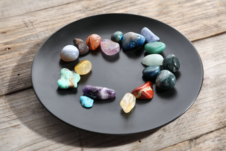 AI Generated. Assortment of colorful gemstones and crystals on wooden plate