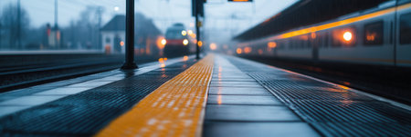 A long perspective view features a train station platform with tracks. The composition highlights symmetrical lines and architectural details. Soft lighting illuminates the scene, enhancing depth and dimension. This image is suitable for various commercial uses, including transportation and travel-related projects.