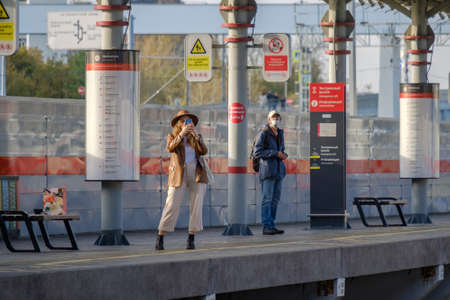 Moscow. Russia. October 4, 2020. A woman and a man stand on the platform of the station and await the arrival of the train. Sunny day. Weekend travel.