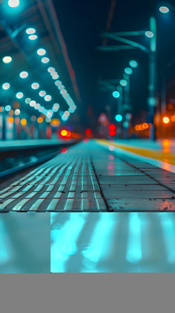 A vibrant nighttime scene of a train station, showcasing illuminated tracks and dynamic motion. The urban landscape reflects energy and modern transport.