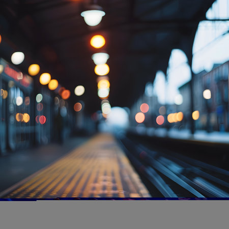 Empty Subway Platform, Blurred Lights, Modern Design, Sleek Industrial Atmosphere, Cool Tones