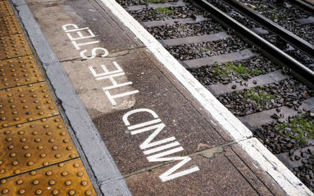 MIND THE STEP written on train platform near rails at London DLR ( Docklands Light Railway ) station