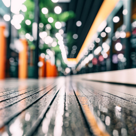 A blurred night scene at a train station with illuminated lights and reflections on the platform.