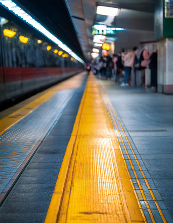 Tactile Paving Dots Detail on Platform, Blurry Commuter Walking, Urban Commute Focus Foreground