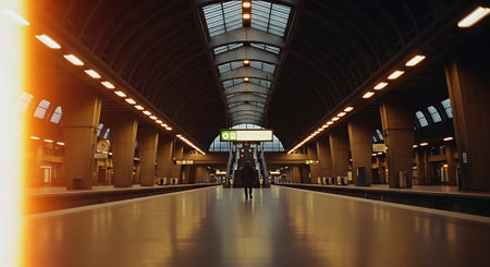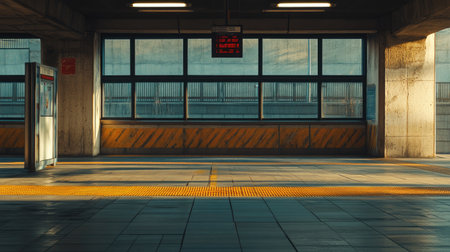 A serene view of an urban train station interior bathed in morning light. The minimalist space showcases modern architecture and inviting atmosphere, perfect for travel and commuting.