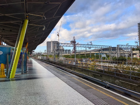 London, UK - 10.24.2021: View of railway tracks and ArcelorMittal Orbit from an empty Stratford DLR station platform on a sunny day under a blue sky