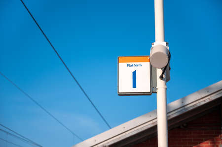 A wide shot of a deserted vintage railway platform with a faded Platform 1 sign and a distant train