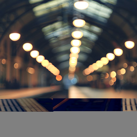 Empty train station platform with railway tracks stretching into the misty distance under a covered canopy with illuminated lights, conveying a sense of travel and journey.