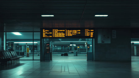 A quiet train station in the evening features a bright digital board listing train schedules. Empty benches hint at a lull in passenger activity.