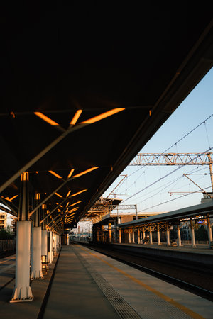 Vertical screen: modern architecture of empty train station platform with illuminated ceiling and visible overhead lines at sunset, creating peaceful and captivating urban scene. Minimalist station