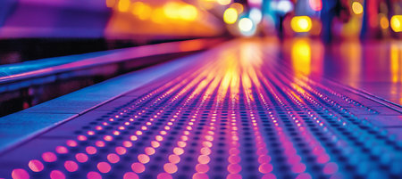 Vibrant City Lights Reflected On Subway Station Platform With Textured Surface At Night.