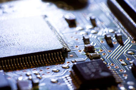 Computer Microchips and Processors on Electronic circuit board. computer hardware technology. Abstract technology microelectronics concept background. Macro shot, shallow focus.