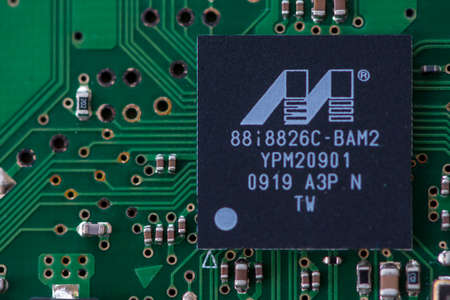 TIMISOARA, ROMANIA - NOVEMBER 10, 2019: Close-up of a Marvell 88I8826C-BAM2 integrated circuit. Electronic components.
