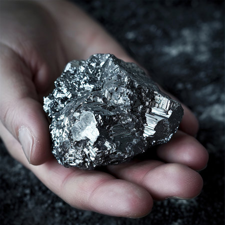A mining worker hand ore mineral rock holding raw metal chunks in dusty palms, documentary closeup of extraction labor and grit
