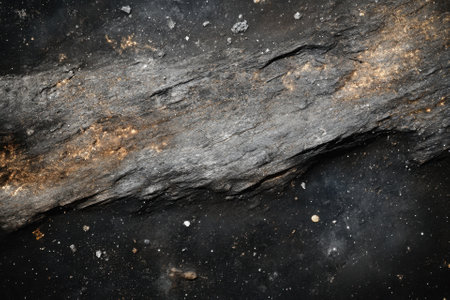 A close-up of a dark gray, rough-textured wood with speckled golden highlights and a blurred black background.