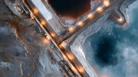 Large Open Pit Mine Surrounded by Rugged Terrain Showcases the Extraction Process at Sunset in a Remote Location. Generative AI