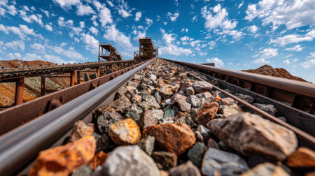 A bustling factory scene with a long, metal conveyor system swiftly moving glossy dark fragments, highlighting industrial efficiency and mechanical rigor.