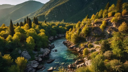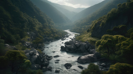 Aerial view of a winding river flowing through a picturesque valley, surrounded by mountains and lush vegetation. Ai generated image
