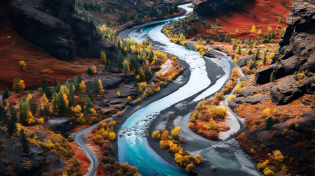 This captivating aerial image showcases a meandering river, surrounded by dramatic landscapes in autumn hues. The flowing water contrasts beautifully with earthy tones.