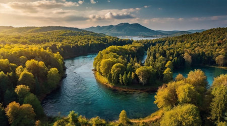 An aerial perspective captures a winding river snaking its way through a dense forest bathed in the warm, golden light of either sunrise or sunset. The sunlight filters through the lush green canopy, creating a dappled effect and illuminating the trees with a vibrant glow. The river's surface reflects the warm light and the surrounding foliage, adding to the serene and tranquil atmosphere of the scene. The vast expanse of the forest and the gentle curve of the river create a picturesque and...