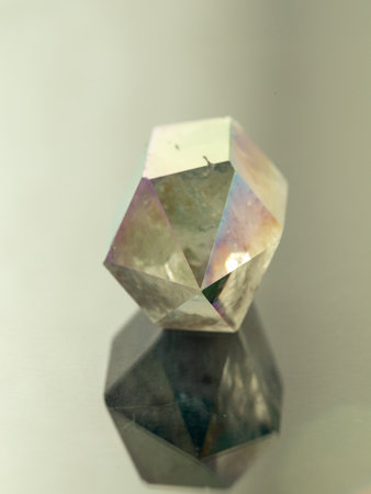 Closeup picture of pure quartz mineral gemstone isolated on a gray background