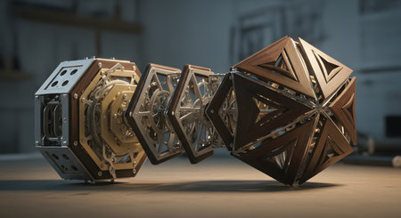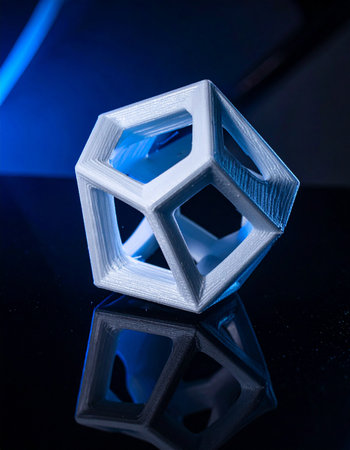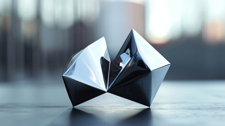 Close-up of a futuristic geometric object with reflective surfaces.